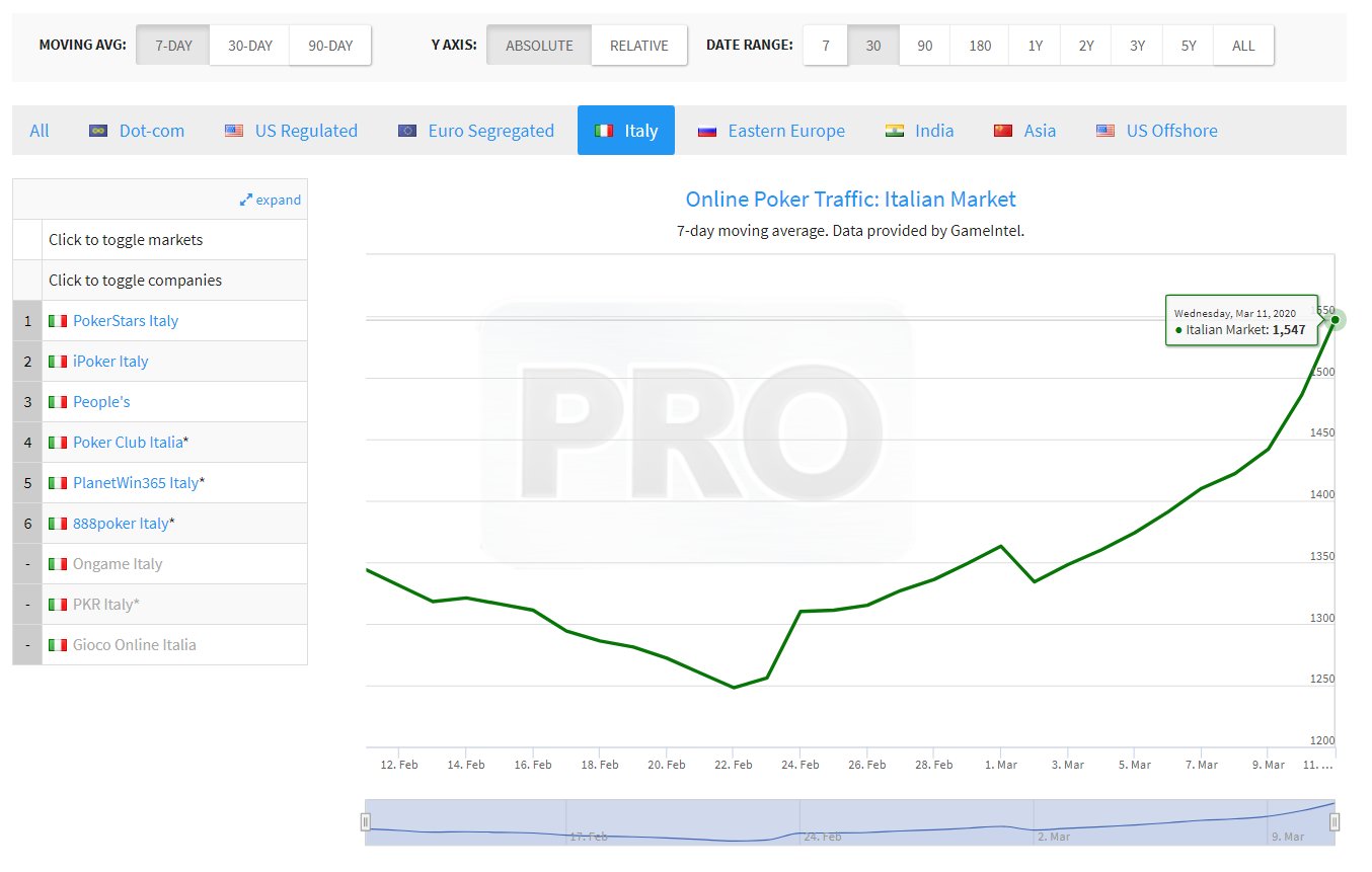 Poniżej wklejam dane dot. Włoch, czyli miejsca na naszym kontynencie, w którym wirus sieje obecnie największe spustoszenie. W dniach od 22 lutego do 11 marca da się zaobserwować znaczący wzrost ruchu na tym rynku. Jestem przekonany, że ta wzmożona aktywność przynajmniej w jakimś stopniu ma związek z epidemią wirusa i koniecznością pozostania w domu.