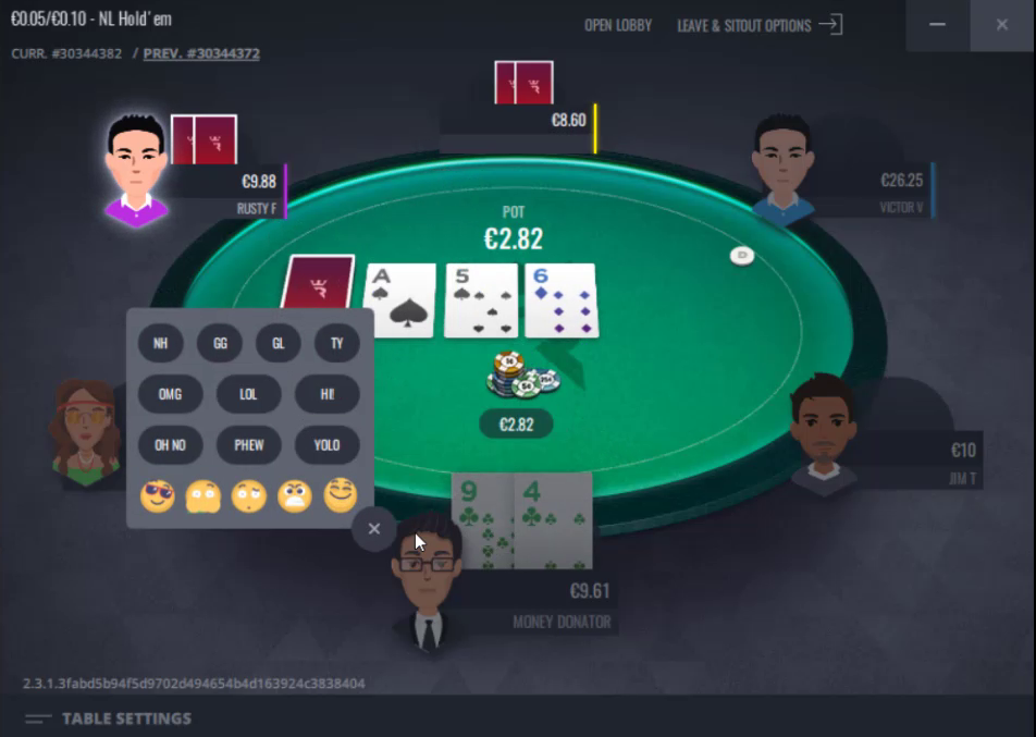 Rozdanie później. Broniłem BB ze średnim connectorem w kolorze, a mój rywal otwierał z wczesnej pozycji. Od flopa miałem draw do koloru i czułem, że przeciwnik może być pod wpływem tiltu. Sizingi jego betów na obu streetach były na tyle małe, że dokładałem i zostałem przez los wynagrodzony. Wypaliłem jako pierwszy na riverze za całość stacka, a mój przeciwnik, który miał znów AA, w tym A blokującego mój kolor, pomyślał i sprawdził. Dobrze, że czatu nie ma na RIO, bo pewnie by mi posłał jobów do zatrzęsienia, ale użył tylko kilka razy opcji OMG i emotikonka „rzyg” i przeszliśmy do trzeciego aktu.