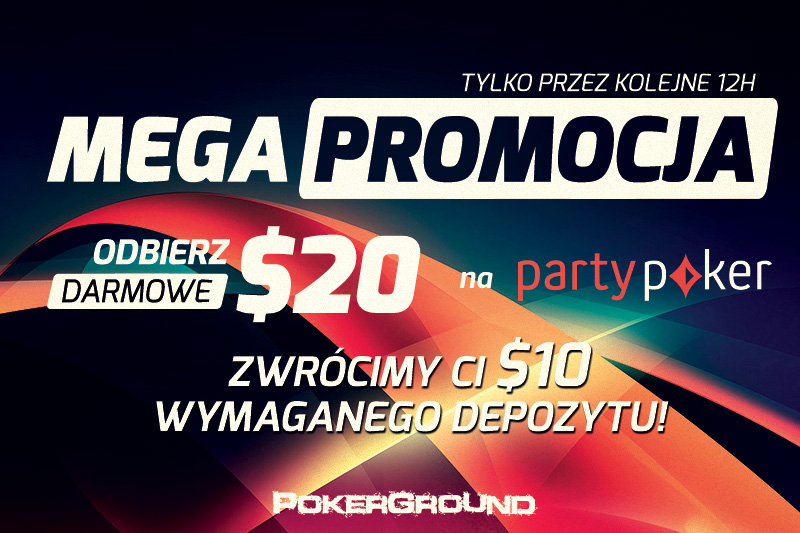 Załóż swoje konto na PartyPoker za pośrednictwem PokerGround do godziny 5 rano we wtorek, 31 maja (najbliższe 12 godzin). Aktywuj je poprzez wpłatę minimum $10 (możesz wpłacić więcej – ta wpłata działa także na bonus 100% do $500. PartyPoker zwraca kwotę max $10) i obierz bonus w wysokości darmowych $20, a my DODATKOWO przelejemy Ci te $10 z powrotem na Twoje konto na PartyPoker lub portfel Skrill/Neteller w ciągu 48h!