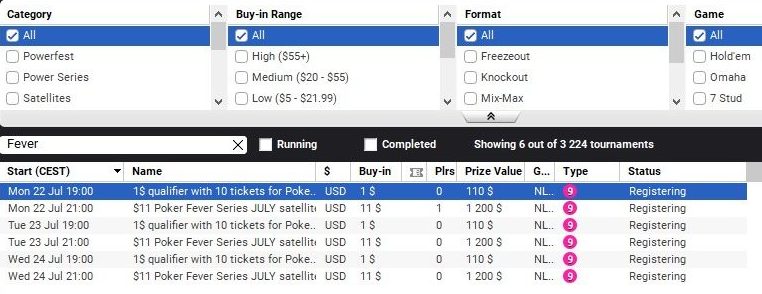 Satelity do Main Eventu znajdziecie w lobby turniejowym, jak tylko zaznaczycie opcję „Restricted/Z ograniczeniami” lub zaznaczycie wszystkie turnieje i w wyszukiwarce wpiszecie frazę „Fever”.