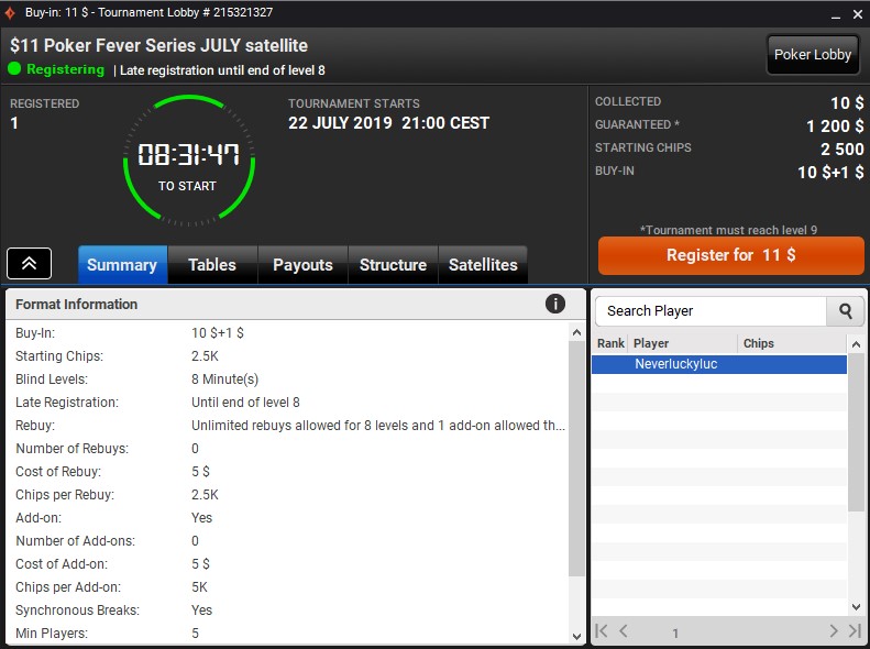 Jak widzicie, w lobby znajdują się trzy feedery za 1$, w których można wygrać bilety do satelity głównej za 11$. Feedery, w których pula gwarantowana wynosi 10 wejściówek, startują zawsze dwie godziny przed głównymi kwalifikacjami.