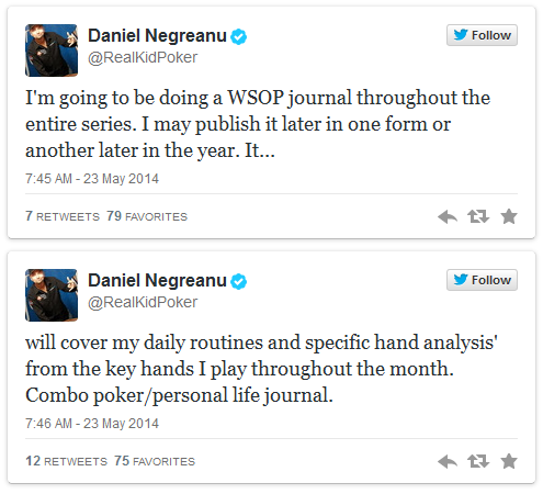 Daniel Neagreanu jest aktywnym użytkownikiem portalu społecznościowego Twitter. W ostatnim wpisie poinformował, że podczas tegorocznego World Series of Poker będzie prowadził dziennik, w którym będzie szczegółowo opisywał dzień po dniu, urozmaicając całość licznymi analizami rozdań z turniejów.