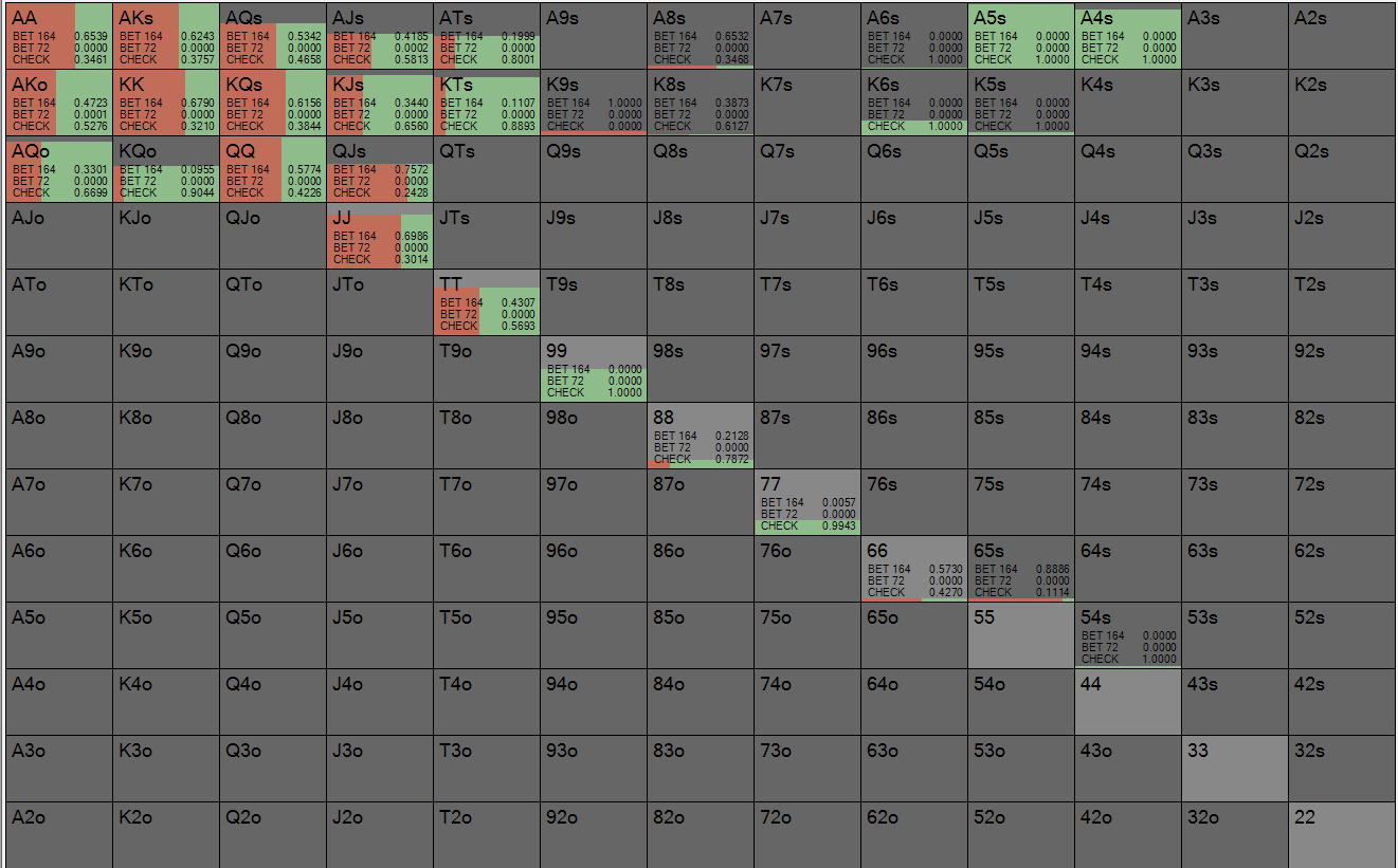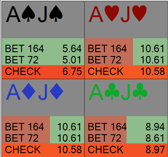 Najgłębszym poziomem, na którym różnicujemy swoje zagrania, jest poziom kombinacji w danym układzie. Np. jeśli posiadamy AJs, możemy rozgrywać je w całkowicie różny sposób. Jak widzicie, dla trzech z czterech kombinacji solver proponuje miksowanie pomiędzy czekaniem i betowaniem. Dla kombinacji w pikach jest to w 100% check.