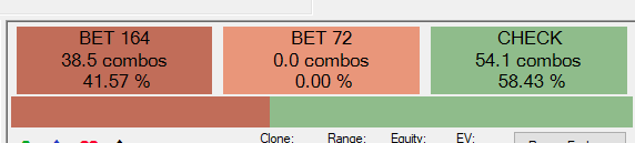 Miksowanie odbywa się na kilku poziomach. Najbardziej ogólny poziom dotyczy strategii dla całego zakresu. Poniżej rozpatrujemy scenariusz w 3-betowanej puli SB vs UTG. Flop to: 9h9d7c. Jest to spot, w którym mamy przewagę nutsów oraz jesteśmy trochę w tyle względem naszego rywala z equity. Stąd chcemy betować rzadziej, za to dużymi sizingami. W poniższym przykładzie solver rekomenduje czekanie w 58% i betowanie dużym sizingiem w 42%. Solver nie lubi w tym scenariuszu betowania za 33% puli.