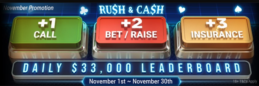 Każdego dnia na GGPoker gracze cashowi ze stołów Rush & Cash mogą rywalizować aż w 14 punktowych wyścigach – w 7 w odmianie NLHE i w 7 w odmianie PL. Łączna wartość nagród na dany dzień wynosi 33.000$. Daje to średnio 1.000.000$ dodatkowej gotówki na przestrzeni całego miesiąca!