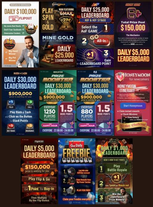 Jeśli chodzi o promocje dla graczy turniejowych, GGPoker przygotowało coś dla miłośników turniejów Spin & Gold. Każdego dnia społeczność podzieli się kwotą 25.000$. Na dodatkowe pieniądze mogą liczyć również gracze toczący boje w formatach Flip & Go oraz Battle Royale. Na tych pierwszych czeka 5.000$ każdego dnia, co daje łącznie 150.000$ w skali miesiąca. Drudzy mogą liczyć na 30.000$.