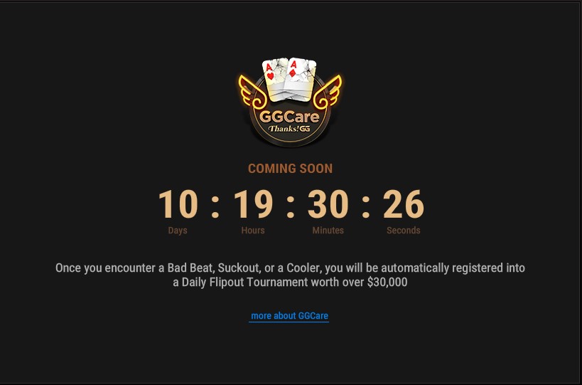- GG Care – już za 10 dni każdy pechowiec, którego spotka jakieś „pokerowe nieszczęście” przy stole, będzie automatycznie rejestrowany do odbywającego się codziennie turnieju Daily Flipout z pulą 30.000$.