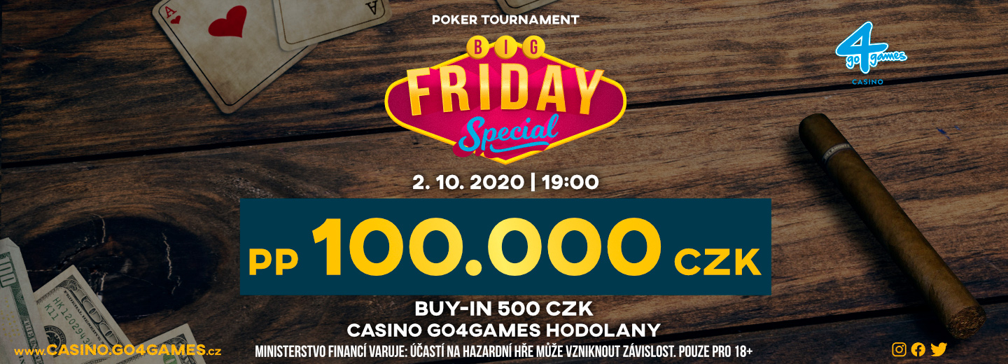 2 października (piątek), o godz. 19:00 wystartuje turniej Big Friday Special. W puli gwarantowanej tego eventu znajduje się 100.000 CZK, a wpisowe wynosi zaledwie 500 CZK. Grę rozpoczniecie ze stackiem w wysokości 25.000, a blindy zmieniać będą się co 15 minut. Gracze będą mogli skorzystać z nielimitowanej liczby re-entry.