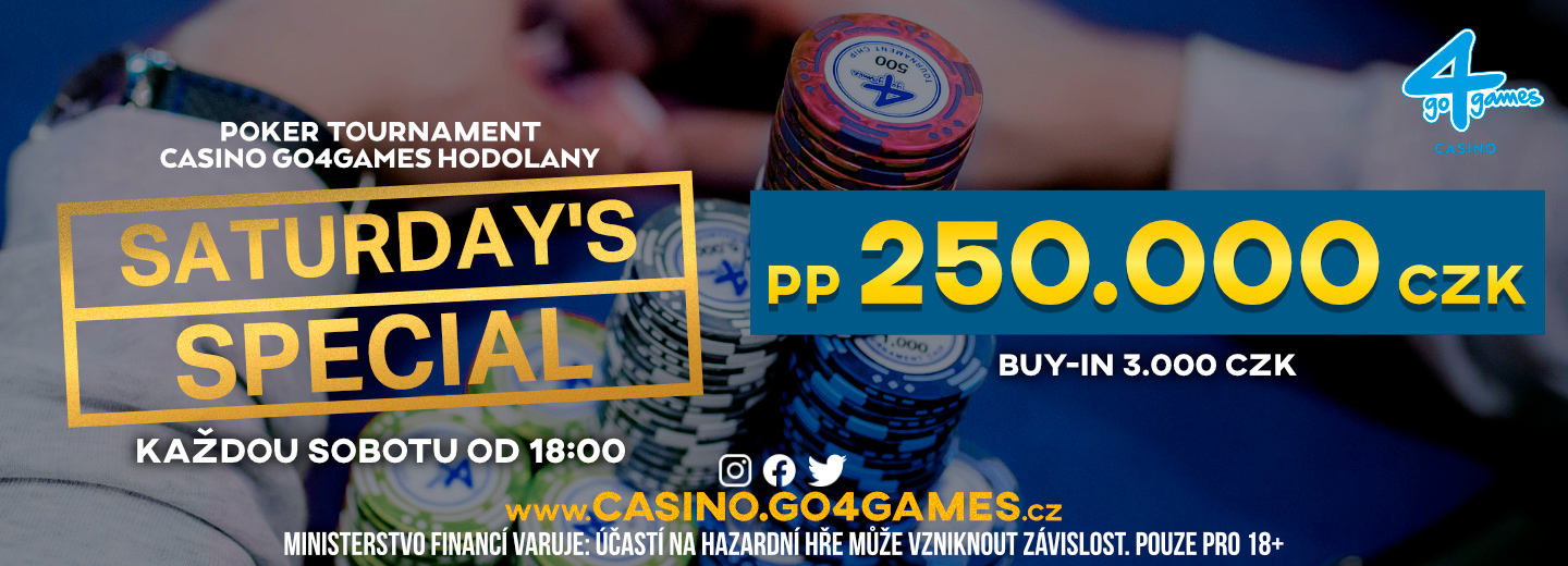 W sobotni wieczór coś dla siebie w ofercie turniejowej Go4Games Hodolany znajdą gracze z grubszymi portfelami. Od godz. 18:00 rozpocznie się rywalizacja w największym regularnie rozgrywanym turnieju na Morawach. Mowa o evencie Saturday Special, do którego wpisowe wynosi 3.000 CZK. W porównaniu z rywalizacją piątkową buy-in jest znacznie wyższy, jednak wyższa jest również pula nagród, która wynosi ćwierć miliona koron!