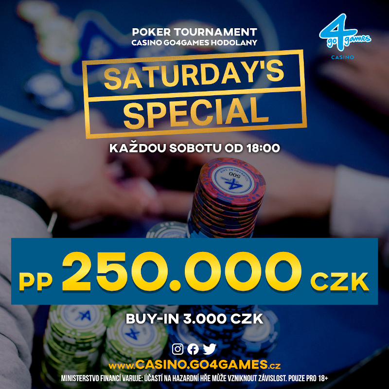 Saturday Special to turniej z wpisowym wynoszącym 3.000 CZK. Jego start zaplanowano na godz. 18:00. Czeka na Was sprawdzona struktura, która przewiduje 30.000 w stacku startowym i poziomy blindów trwające 25/30 minut. Późna rejestracja potrwa do zakończenia dziesiątego levelu (do godz. 22:45).