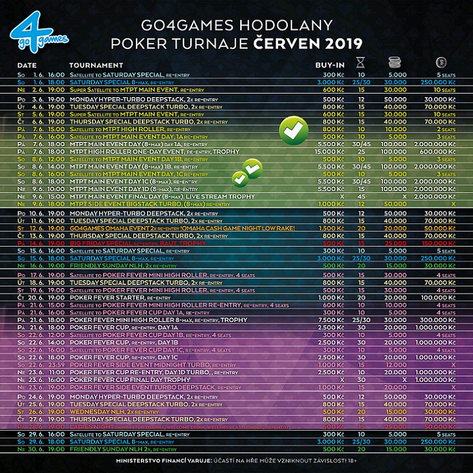 Czerwiec w Go4Games to także czas, gdy zostanie rozegrana kolejna edycja Poker Fever Cup. Festiwal rozpocznie się 20 czerwca, a pierwszym turniejem w harmonogramie jest Poker Fever Starter. Wpisowe to 1.000 CZK, a gwarantowana pula to 100.000 CZK. Zawodnicy mogą skorzystać z re-entry.