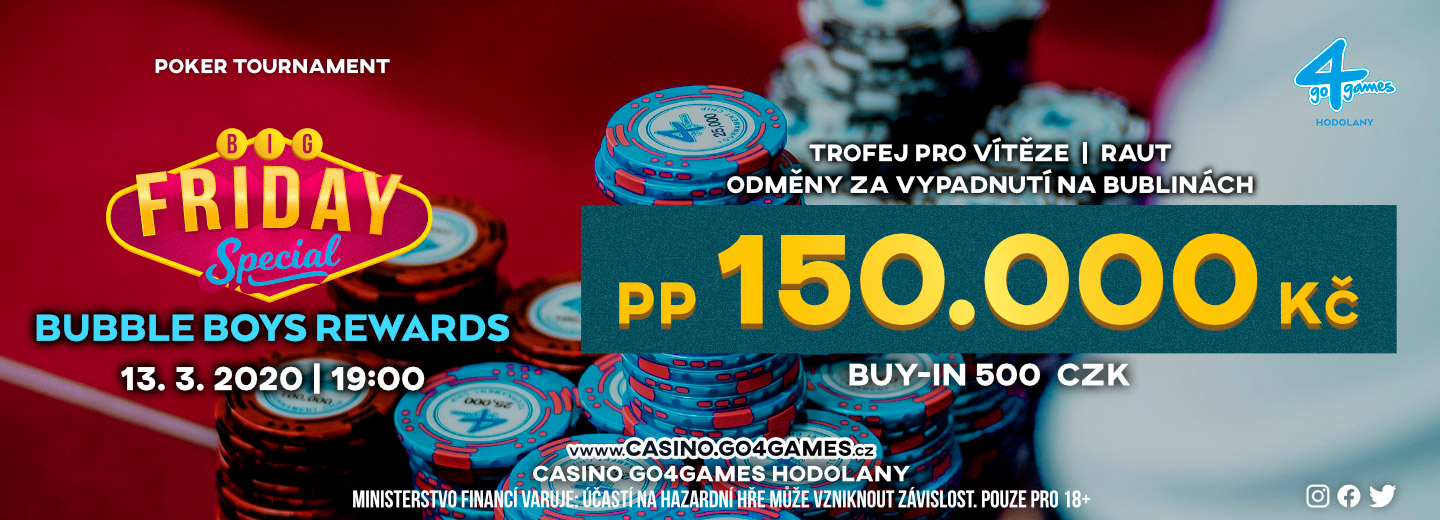 W piątek możecie cieszyć się z udziału w turnieju, który ma znakomity stosunek wysokości wpisowego do puli gwarantowanej. Event Big Friday Special – Bubble Boys Rewards to doskonały wybór na zakończenie tygodnia roboczego. Za jedyne 500 CZK weźmiecie udział w grze o część z 150.000 CZK! Próg gwarantowany tego turnieju obliczony jest na 300 rejestracji!