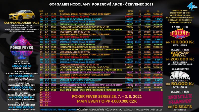 W lipcu czeka Was prawdziwa pokerowa jazda w Go4Games Casino Hodolany. W bieżącym miesiącu wartość łącznej puli gwarantowanej wynosi aż 9.000.000 CZK. Nadal walczymy o Mercedesa (A-klasa) przy stołach cashowych.