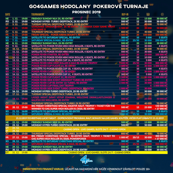 • 4 grudnia, od godz. 19:00: G4G Omaha Event, 2x re-entry, buy-in 1.500 CZK, pula nagród 50.000 CZK. Stack startowy: 20.000 in chips, 20-minutowe blindy.