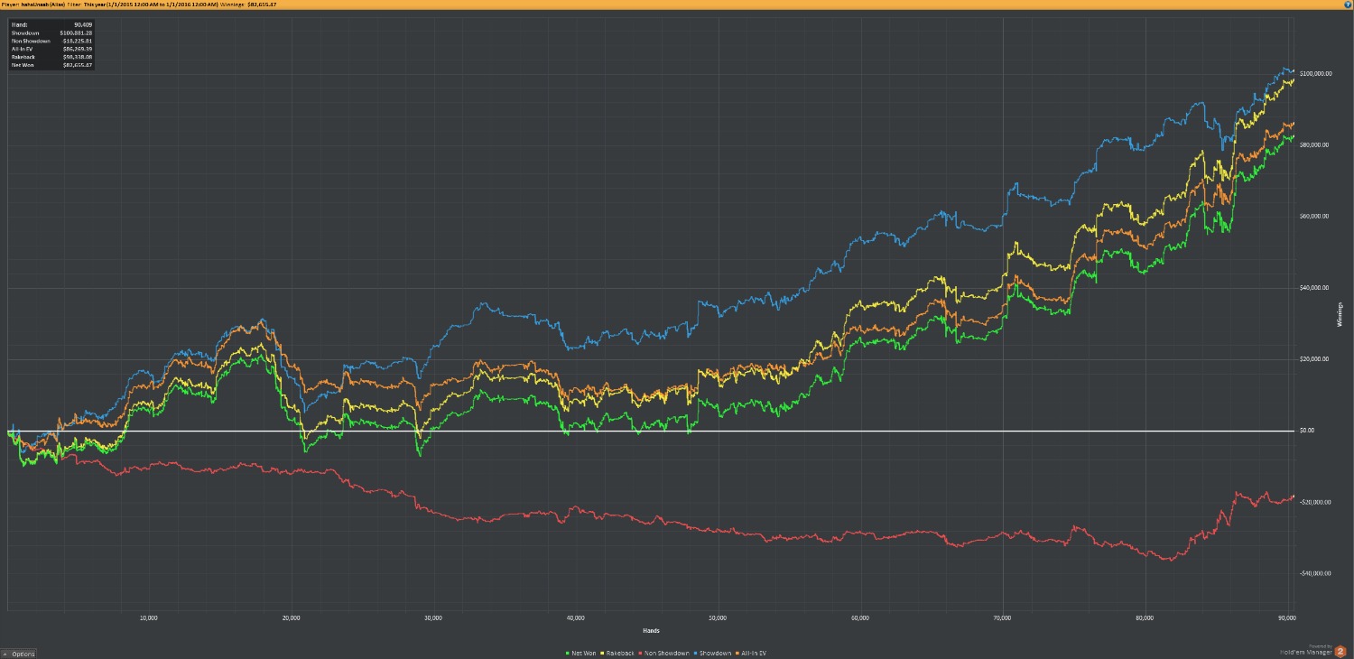 Jeżeli nie mieliście okazji trafić do tej pory na wyniki, wykresy HahaUnaab’a, to o jego nieprzeciętnych umiejętnościach podejmowania odpowiednich decyzji przy stole pokerowym powinien Was przekonać przynajmniej poniższy wykres, który obrazuje wygranie 100.000$ w 60 dni! Często trenerzy nie chcą dzielić się swoimi wynikami, z różnych powodów oczywiście. Ale dla ewentualnych uczniów zawsze jest to przyczynek do wątpliwości. Robert bez wahania je rozwiewa, umieszczając na swoim blogu bardzo regularnie wykresy, poświadczające umiejętności osiągania dwucyfrowego wyniku, liczonego w bb/100!