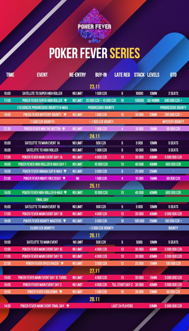 | 20:00 | Poker Fever Live Final | 240€ (jeden bilet) | 10€ | 1x bilet do ME (4000 CZK) oraz bilet do side eventu 1.500 CZK |