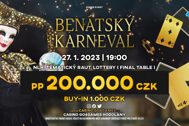 A już w piątek zapraszamy na wyjątkowy event o nazwie Benátský karneval. W czasie tego turnieju przeniesiemy się do Wenecji. W kasynie Go4Games będzie panował odpowiedni wystrój. Oprócz 200.000 CZK w gwarantowanej puli nagród organizatorzy przygotowali szereg atrakcji: poczęstunek dla graczy, a także loterię z nagrodami dla graczy, którzy dostaną się na FT tego eventu.
