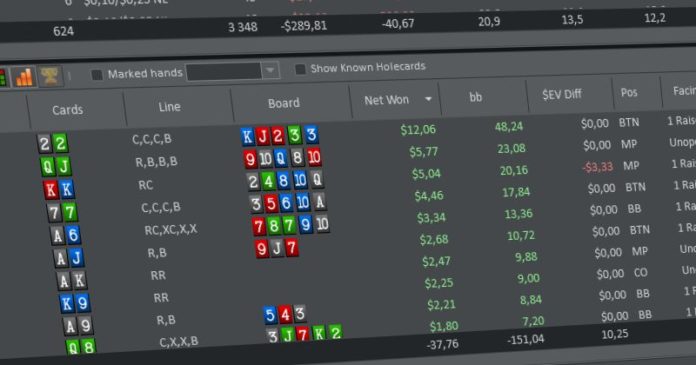 Teraz, gdy już oznaczyliśmy interesujące nas rozdania, możemy do nich wrócić, przeglądając sesje w naszym programie trackującym. Wyłowimy je klikając w pole „Show Marked Hands Only”.