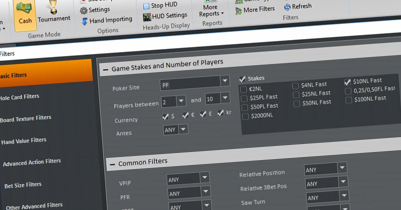 Dla dużych pul proponowaną wartością byłoby 100-500 big blindów, dla niskich/średnich niech to będzie 30-100 big blindów. W Hold’em Managerze 2 jest jeszcze prościej. Klikamy przycisk More Filters w głównym oknie zakładki Reports i tam już sobie ustawiamy, jakie rozdania nas interesują.
