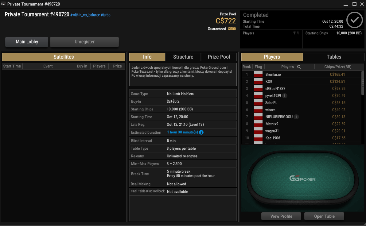 Pierwszy turniej odbył się wczoraj, tj. 12.10. Zagrało w nim 111 graczy. Po 2 godzinach i 44 minutach poznaliśmy zwycięzcę, którym został gracz kryjący się pod nickiem Broniarze. W nagrodę za zgarnięcie wszystkich żetonów w turnieju na konto tego gracza trafiło 165,41$C.