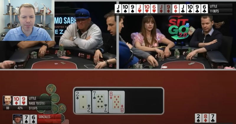 Little przyznaje, że T9o nie jest świetną ręką do sprawdzania przebić przed flopem. Do dodania miał jednak tylko 100$, podczas gdy pula wynosiła 375$. W tej sytuacji będzie więc sprawdzał z szerokim zakresem – zwłaszcza przeciwko Gonzalesowi, o którym wie, że uwielbia blefować.