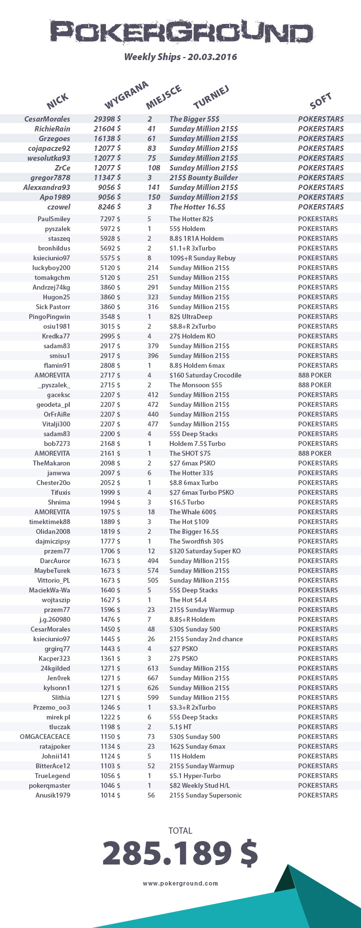 Oczywiste było, iż ten weekend będzie stał pod znakiem jubileuszowego turnieju Sunday Million z pulą gwarantowaną 10.000.000$. Jednak zanim wspomnimy o najlepszych rodakach w tym turnieju, zaczniemy od shipów w turniejach, z może mniejszą pulą gwarantowaną, lecz równie ważnymi dla grinderów. Rozpoczął wszystko Gregor7878, którego ship składa się z dwóch części, gdyż nastąpił w turnieju Bounty Builder za 215$. Następny w kolejce był CesarMorales w turnieju The Bigger 55$, a później to już wszystkie oczy zwrócone były na występy Polaków w Sunday Millionie.