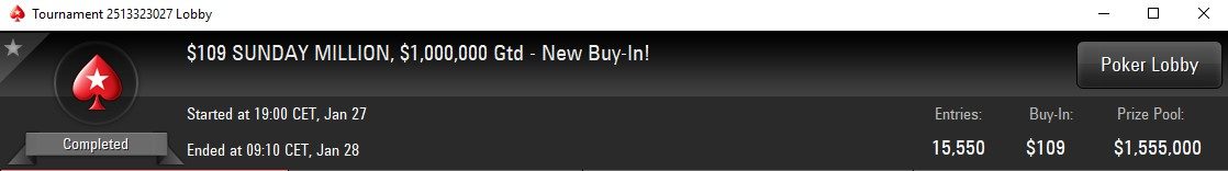 Gwarantowana pula nagród pozostała na poziomie 1.000.000$. Nie trzeba być matematycznym geniuszem, żeby szybko stwierdzić, że gdy wpisowe obniżono o połowę, a pula pozostała taka sama, to potrzeba dwukrotnie zwiększyć liczbę rejestracji, żeby obronić turniejową gwarancję. Jeszcze niedawno potrzeba było do tego 5.000 wpisowych, a obecnie 10.000. 27 stycznia, w czasie pierwszej edycji Sunday Million 109$, gracze opłacili aż 15.550 rejestracji – 12.458 unikalnych wpisowych oraz 3.092 re-entry.