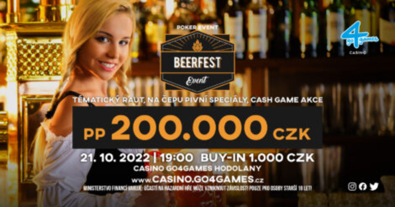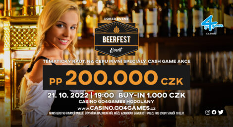 A już w najbliższy piątek w kasynie Go4Games Hodolany zapraszamy na Beerfest, w trakcie którego rozegrany zostanie event z pulą nagród 200.000 CZK. Jest to wydarzenie specjalne, w trakcie którego gracze będą mogli skosztować smacznych piwnych przekąsek oraz różnych piw. Dla uczestników gier cashowych piwo będzie darmowe przez cały wieczór.