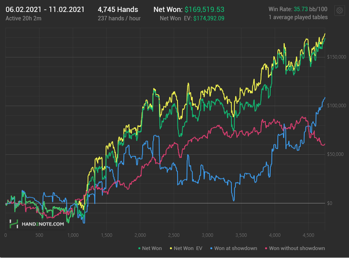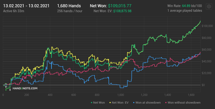 Kolejna grafika prezentuje lanie, jakie Wiktor zebrał 13 lutego. Swoją drogą, czym jest swing na 10 buy-inów w grze HU na dwóch stołach? Niestety prawdą jest, że te rezultaty wyglądają niepokojąco. Spójrzcie na czerwoną linię Rosjanina.