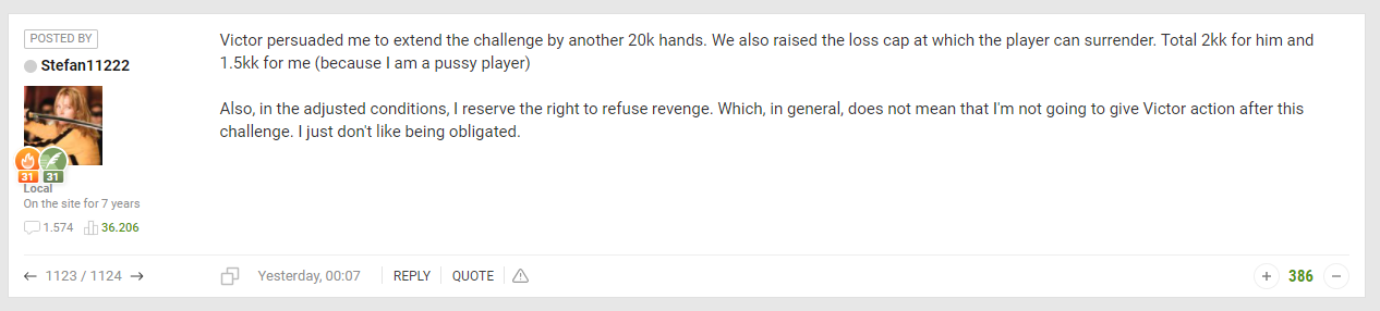 Stefan ogłosił na swoim blogu, że zdecydował się na przyjęcie warunków, które zaproponował mu Polak. Oznacza to, że pojedynek będzie wydłużony o koleje 20.000 rozdań, a każdy z graczy będzie mógł opuścić grę: Wiktor jeśli będzie na minusie 2.000.000$, a Stefan 1.500.000$, bo według naszego gracza jest, jakby tu powiedzieć, żeby za bardzo nie przeklinać, „bardziej dowcipnym graczem…”.