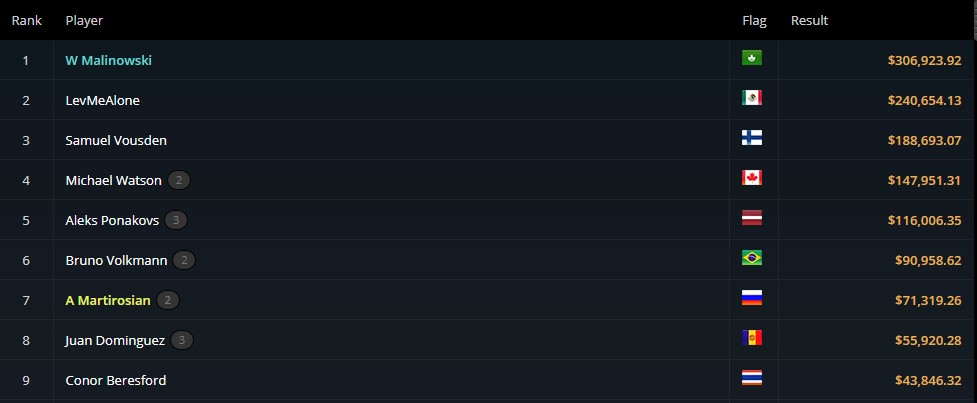 Za zajęcie 1. miejsca Wiktor Malinowski zainkasował 306.924$. Pokonany w heads-upie Lev Gotlieb odebrał 240.654$. Do Samuela Voudsena trafiło 188.693$.