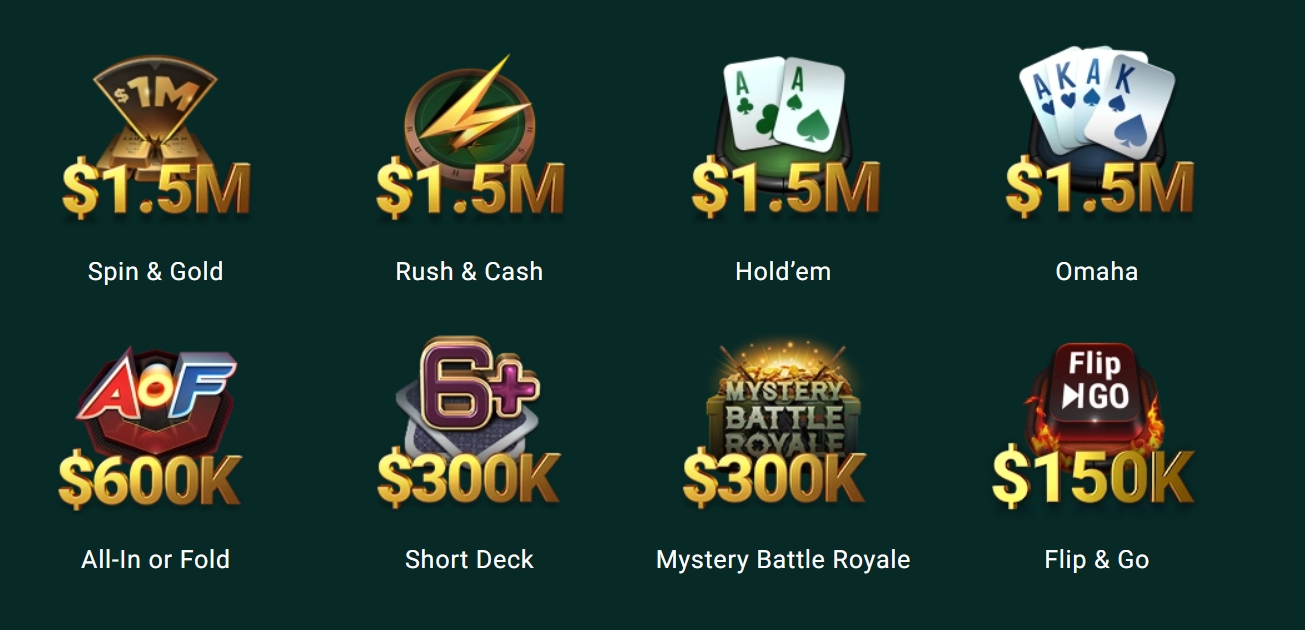 Takie wyścigi odbywają się także na All-in or Fold, Short Deck, Mystery Battle Royale oraz Flip & Go (wszystkie stawki). Każdy wyścig trwa 24 godziny, a klasyfikację można sprawdzić na stronie. Trzeba pamiętać, że wygrane z wyścigów gracz otrzymuje w „walucie” danej gry, tj. turniejowe to T$ do wykorzystania w turniejach, Spin & Gold to bilety, cash to Cash Dollars na gry cashowe.