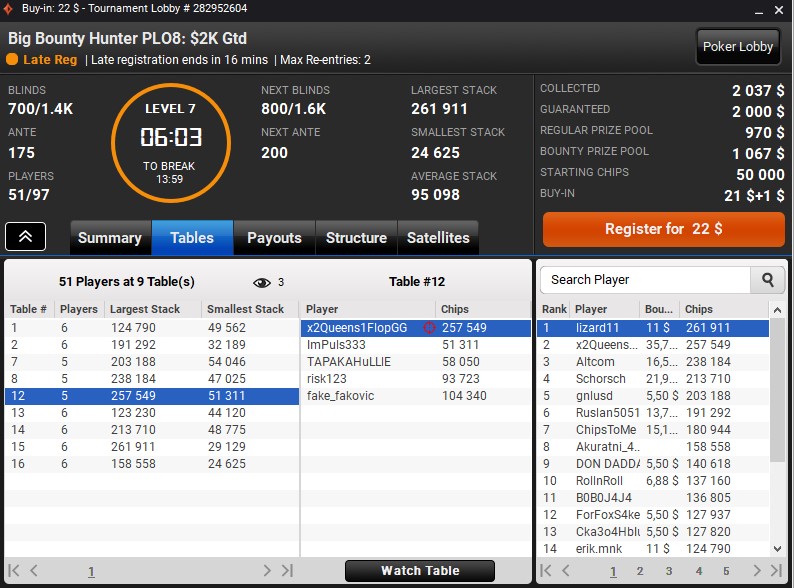 Jeśli nie wiecie, czym są turnieje PKO, spieszymy od razu z wyjaśnieniem. W turnieju rozgrywanym w tym formacie Wasze wpisowe dzielone jest na dwie równe części (najczęściej). Jedna część zasila regularną pulę nagród, którą później dzielą się szczęśliwcy, którzy kończą swój występ na miejscach płatnych. Druga część wędruje do puli bounty, z której wypłacane są konckouty. Po eliminacji z gry danego uczestnika turnieju jego kat przejmuje jego bounty, przy czym połowę wartości bounty od razu otrzymuje w formie przelewu na swoje konto na poker roomie, a wartość drugiej połowy dolicza się nam do bounty, które wisi nad naszą głową.