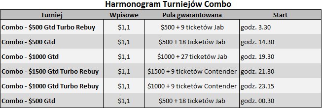 W pokerowym lobby możecie obecnie zobaczyć turnieje, które oznaczone są jako „Combo”. Oprócz standardowej puli nagród są w nich do wygrania wejściówki do turniejów The Jab oraz The Contender.