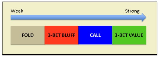 Typowy gracz z mikrostawek często będzie też osobą, która z każdej pozycji otwiera zbyt luźno, a następnie bardzo łatwo poddaje się do 3-betu. Przeciw takiemu przeciwnikowi MUSIMY posiadać: 3-bet range dla wartości; 3-bet range dla blefu, a wszystko co znajduje się pomiędzy tymi dwoma ekstremami – układy średniej wartości, często z potencjałem i układy dominujące rywala – powinniśmy dorzucać do flatting range’u (czyli do sprawdzeń). Oczywiście ostatnią częścią naszego zakresu powinny stanowić foldy. Jeśli w ten sposób konstruujemy swój range vs otwarcia, możemy powiedzieć, że jest on spolaryzowany.