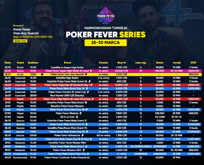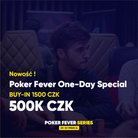 Organizatorzy marcowej edycji Poker Fever Series mocno wzięli sobie ten argument do serca i zaproponowali mocno zmieniony plan gier. Stali bywalcy od razu zauważą w nim przesunięcie rozpoczęcia festiwalu na środę, co jest następstwem usunięcia z planu gry eventu Poker Fever CUP, i zastąpienie go jednodniowym eventem Poker Fever One-Day Special. Do gry w tym turnieju przystąpicie za jedyne 1.500 CZK, a w puli nagród znajdzie się aż 500.000 CZK!