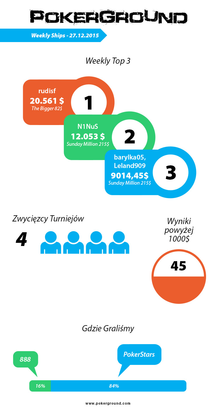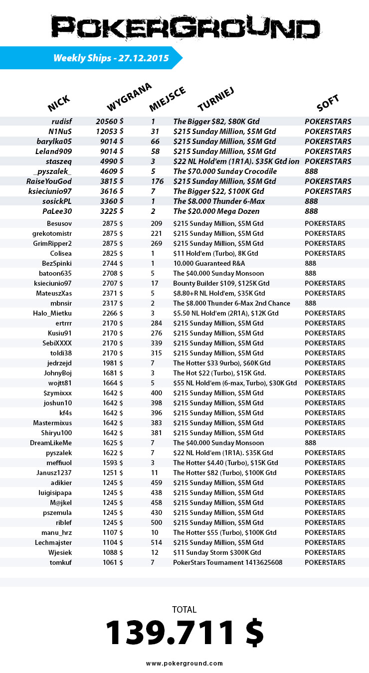4 „szipy” Polaków, z których najbardziej cieszy jeden „pięciomasztowiec„. Generalnie niedziela zdominowana przez ITM-y związane ze specjalną edycją turnieju Sunday Million. Kilka przyjemnych wyników na „Ósemkach”. Tak w skrócie można opisać wczorajsze osiągnięcia naszych rodaków. Sprawdźcie szczegóły poniżej.