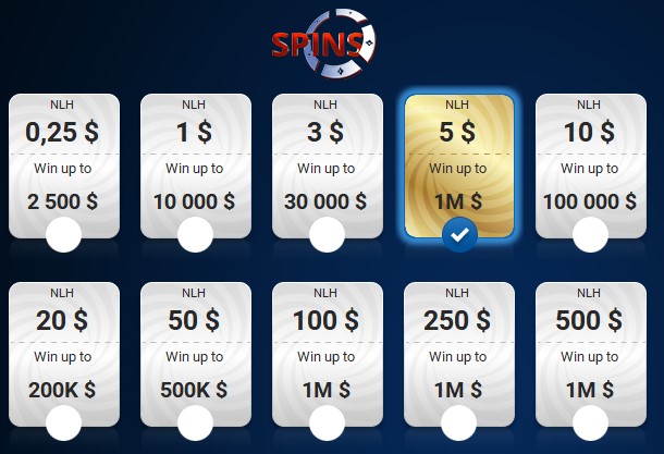 Zapraszamy do udziału w grach SPINS na PartyPoker. Tylko tam w zaledwie kilka minut można zostać milionerem! Obecnie w lobby szansę wygrania miliona macie na czterech stawkach: oczywiście na tych najwyższych, ale też w grach za 5$, co sprawia, że milion leży w zasięgu każdego z Was.