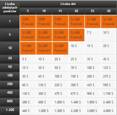 Nie musicie zdobywać punktów w następujące po sobie dni. Po prostu dodamy liczbę dni, podczas których w trakcie okresu promocji osiągnęliście odpowiedni pułap punktów. Na przykład, jeśli zdobędziecie 10 punktów dziennie w ciągu 10 dni, zrobicie sobie 5-dniową przerwę i następnie uzbieracie 10 punktów w każdy z kolejnych 10 dni promocji, otrzymacie nagrodę gotówkową w wysokości 10 $ za zdobycie 10 punktów dziennie w ciągu 20 dni.