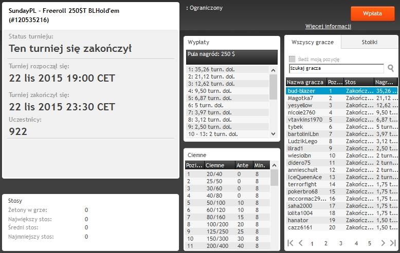 Punktualnie o godzinie 19:00 wystartował darmowy SundayPL z pulą 250$T, w którym udział wzięła rekordowa liczba 922 graczy. Po blisko 5 godzinach rywalizacji zwycięzcą został Bub-Blazer, który otrzymał $35,26 pokonując w pojedynku jeden na jednego gracza ”Magotka7”