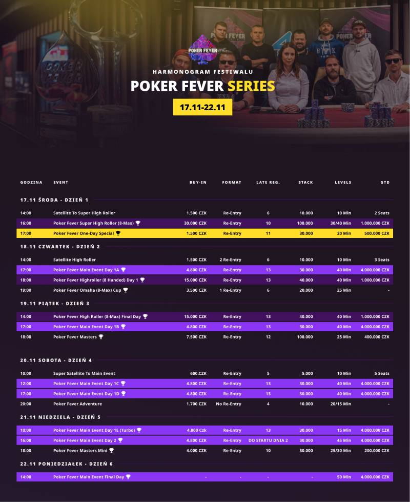Już za niecały miesiąc ponownie spotkamy się w Ołomuńcu. Tym razem gracze z Polski oraz z całego regionu przyjadą do Go4Games Hodolany, aby wziąć udział w festiwalu Poker Fever Series. Rywalizacja rozpocznie się 17 listopada i potrwa sześć dni. Oto harmonogram imprezy.