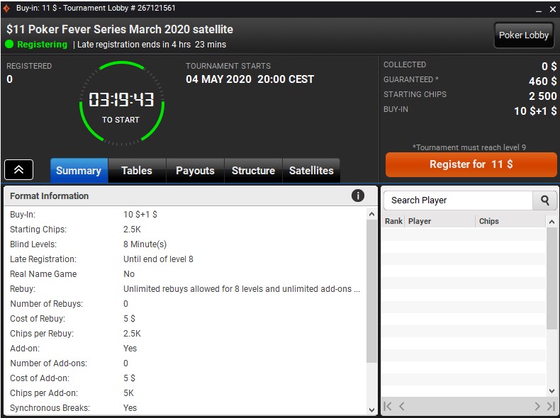 Do lobby PartyPoker powróciły satelity do eventów Poker Fever! Sytuacja kryzysowa z koronawirusem nie jest jeszcze wprawdzie do końca zażegnana, jednak możemy oczekiwać tego, że z tygodnia na tydzień wszystko będzie budzić się z powrotem do życia. Np. wczoraj ogłoszono rychłe otwarcie King’s Casino (więcej informacji – tutaj) Spodziewamy się również tego, że w niedługim czasie gości ponownie zacznie przyjmować Go4Games Casino Hodolany.