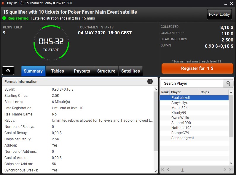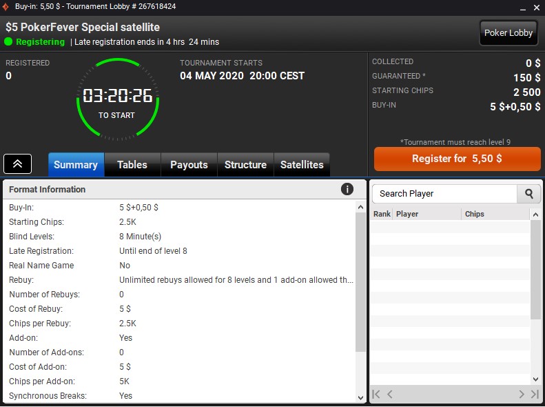 Wpisowe do PF Special wynosi zaledwie 5,50$. Za 5$ można nabyć re-entry oraz add-ona. W puli gwarantowanej znajdują się dwie wejściówki – każda o wartości 75$.