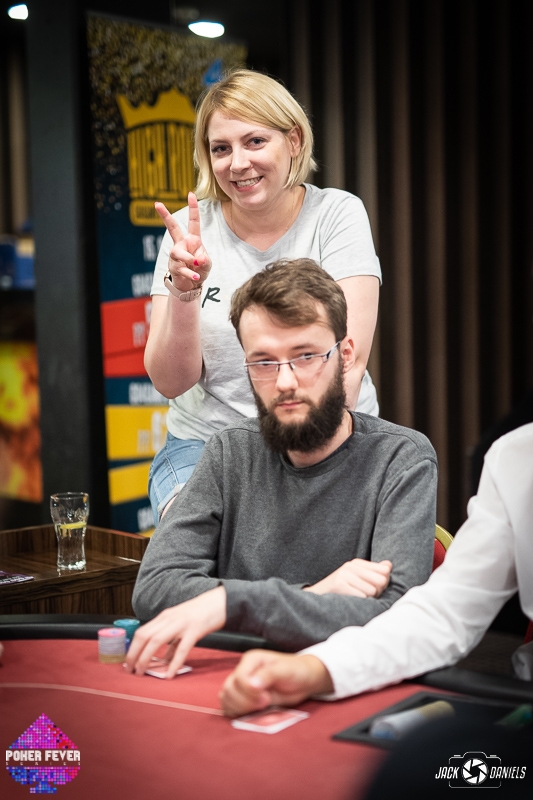 W tym czasie pulę średniej wielkości wygrał Majkel. Polak otworzył z AJ. Czech bronił blinda z K7. Na flopie 7-high nasz gracz zagrał c-bet. Turn został przeczekany z obu stron. Gdy na riverze spadł J, Czech zaczekał, a Majkel zagrał nieduży value bet, który kręcący głową rywal opłacił.