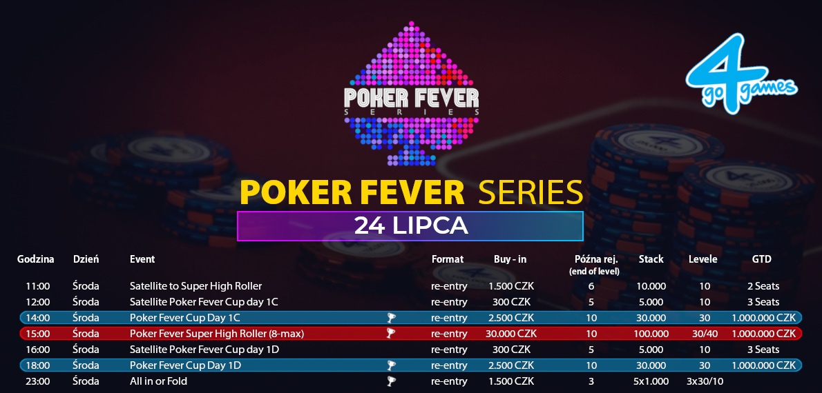 Już jutro czekają nas jeszcze większe emocje. Gramy dwa flighty startowe do Poker Fever CUP. Ponadto wystartuje jutro Super High Roller z wpisowym 30.000 CZK. Dzień zakończy event specjalny All-in or Fold.