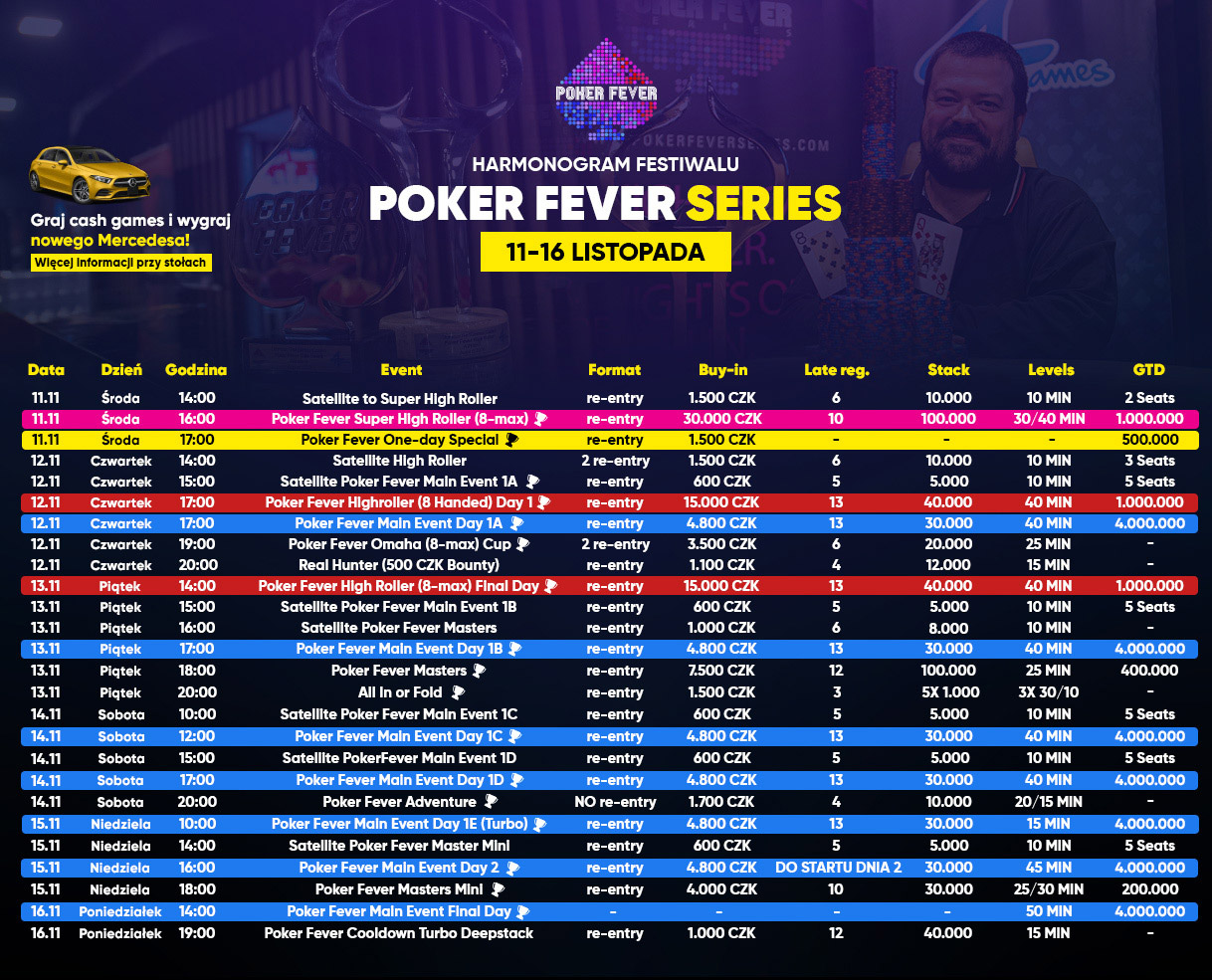 Jak większość z Was pewnie wie, w listopadzie Poker Fever planuje zorganizować kolejny duży festiwal w Go4Games Casino Hodolany w Ołomuńcu. To wydarzenie początkowo miało odbyć się w ostatnim tygodniu miesiąca. Tak jednak nie będzie. Dziś organizatorzy potwierdzili oficjalnie ostateczną datę rozgrywania festiwalu, który odbędzie się w dniach od 11 do 16 listopada!