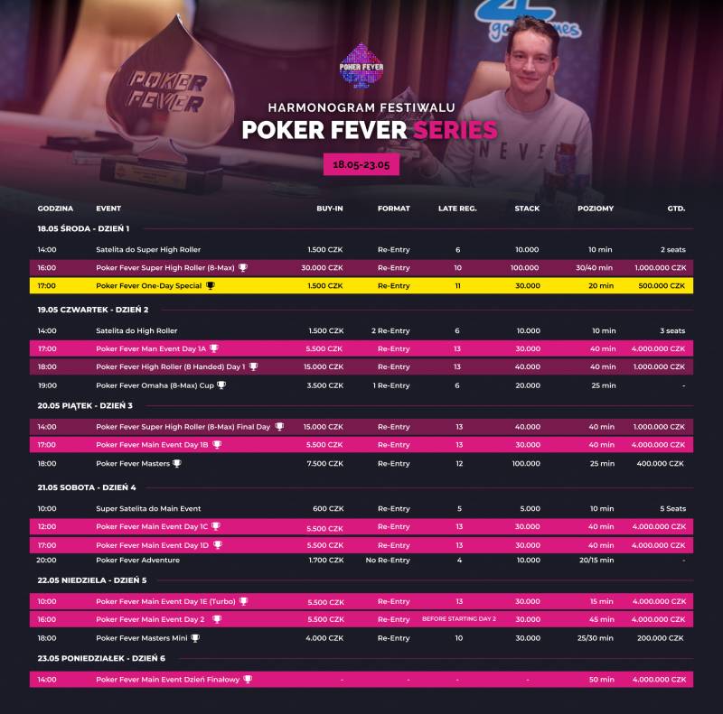 Jak widzicie: Żeby wygrać, trzeba grać, dlatego już teraz serdecznie zapraszamy Was do przyjazdu do Ołomuńca na majową edycję festiwalu Poker Fever Series. Wy również możecie zdobywać puchary i niemałe pieniądze. Oto szczegółowy harmonogram tego wydarzenia.