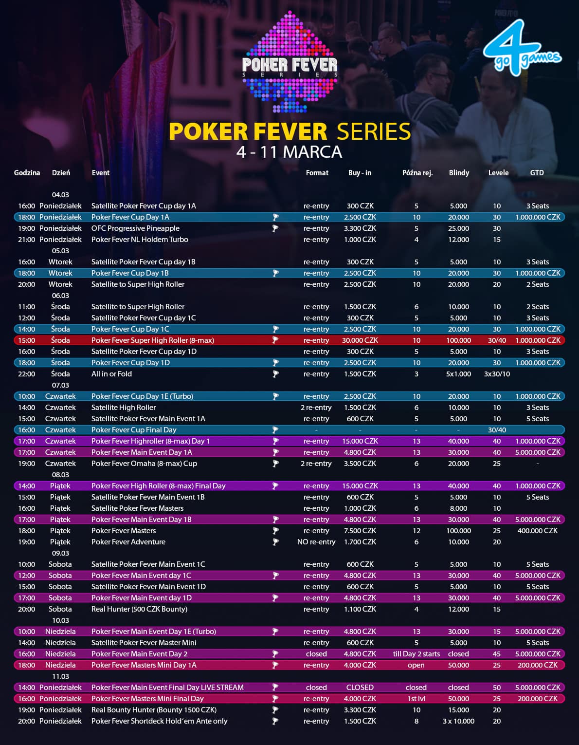 Marcowy Poker Fever rozpocznie się eventem Poker Fever CUP. Za jedyne 2.500 CZK będziecie mogli powalczyć o część z 1.000.000 CZK GTD. Flight 1A tego turnieju ruszy 4 marca, a zwycięzcę poznamy 7 marca.