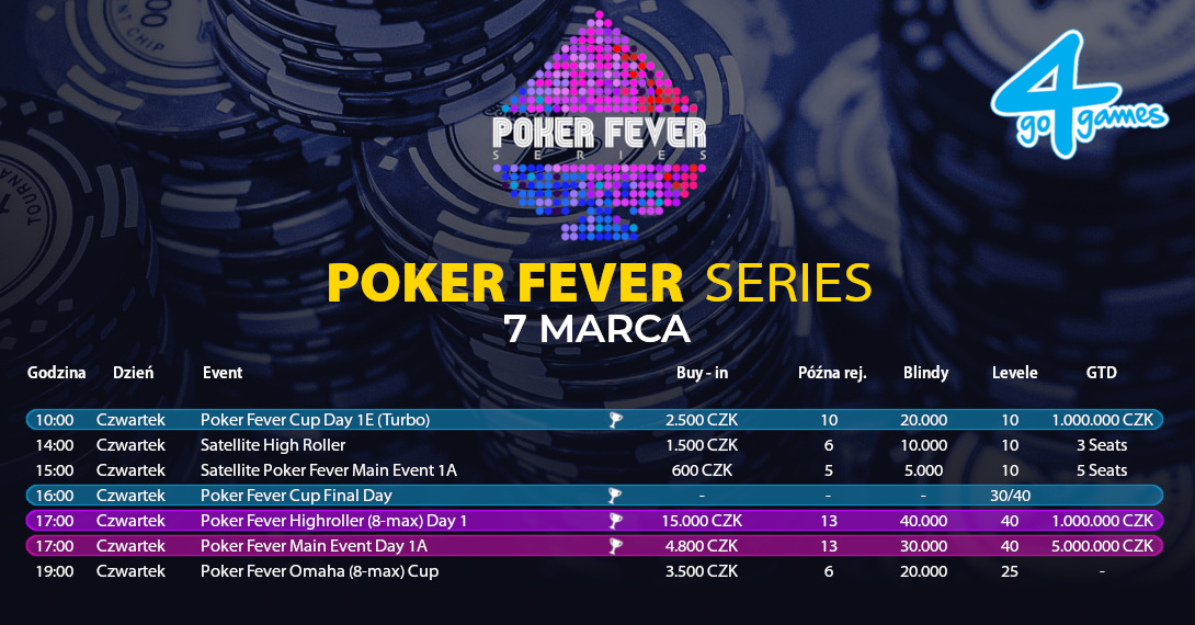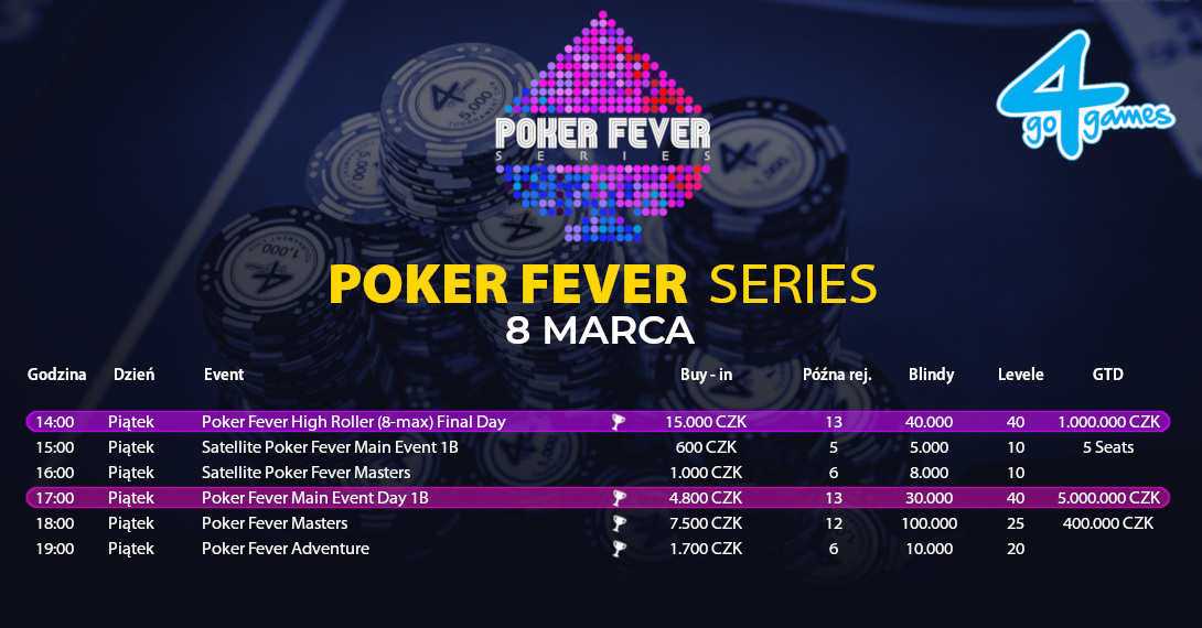 Poker Fever Series, marzec 2019, dzień 4. Z Go4Games Casino w Ołomuńcu wita Was serdecznie Doro. Od godz. 17:00 będę prowadził dla Was relację z Main Eventu oraz eventu High Roller. Zapraszam do wspólnej zabawy.