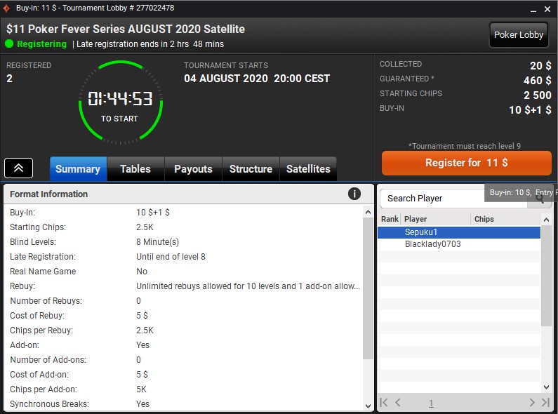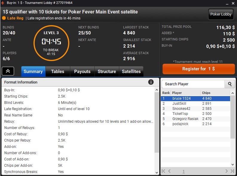 • wygrać bilet do satelity głównej w satelicie niższego poziomu, która startuje codziennie, o godz. 18:00; od poniedziałku do soboty w każdym takim turnieju Poker Fever gwarantuje aż DZIESIĘĆ wejściówek (każda o wartości 11$); w niedziele jest to aż DWADZIEŚCIA PIĘĆ wejściówek!